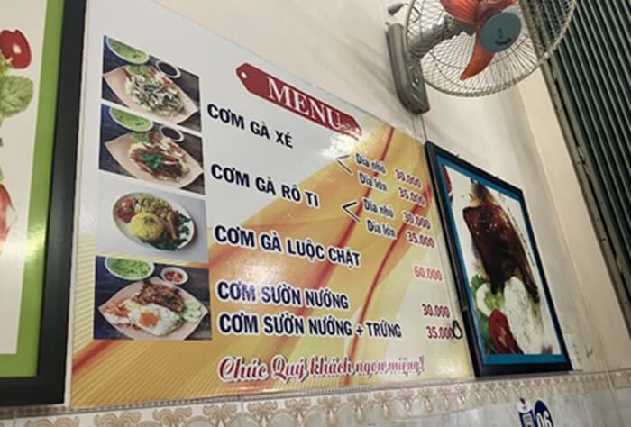 Hạt cơm mềm, dẻo; thịt ga ta ngọt dai, nêm nếm rất vừa miệng. Menu có cơm gà quay, cơm gà luộc, cơm gà xào sả ớt, cơm gà, cánh gà chiên nước mắm và bún bò, giò. Không chỉ ngon mà giá còn rất phải chăng, từ 30.000 – 60.000đ.